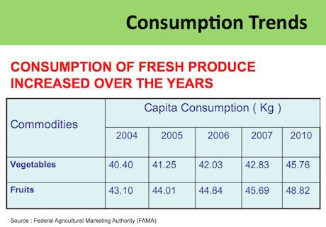 Andamento dei consumi di frutta e verdura in Malesia. Il consumo di prodotti ortofrutticoli freschi aumenta ogni anno. Nel 2010 in Malesia sono stati consumati 45,76 kg di verdure e 48,82 kg di frutta pro capite.