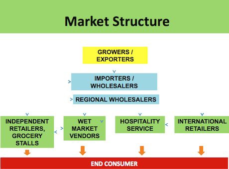 La struttura del mercato ortofrutticolo in Malesia, dall'alto: produttori/esportatori, importatori/grossisti e grossisti regionali. In verde: dettaglio indipendente e negozi alimentari, mercati all’aperto, servizi di ospitalità, dettaglio internazionale. Alla fine della catena, c'è il consumatore finale.
