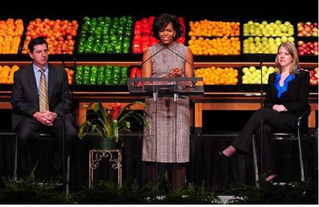 In foto: gennaio 2011, Michelle Obama e Bill Simon di Walmart annunciano il piano della catena per offrire opzioni alimentari più sane e più accessibili ai clienti.