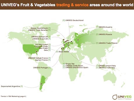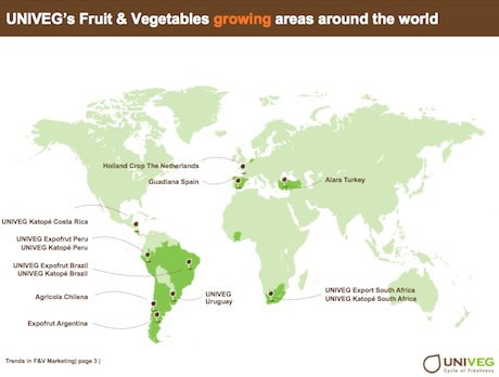 Il Gruppo Univeg (nella foto sopra, le varie aree del mondo nelle quali la compagnia è presente con proprie produzioni) è un fornitore mondiale di prodotti freschi ed è attivo nei quattro settori chiave di: Ortofrutta, Fiori e piante ornamentali, Convenience, Trasporti & Logistica. Con un fatturato annuo di 3 miliardi di euro, il Gruppo Univeg, con sede centrale in Belgio, impiega 9.000 persone in 25 paesi su quattro continenti.