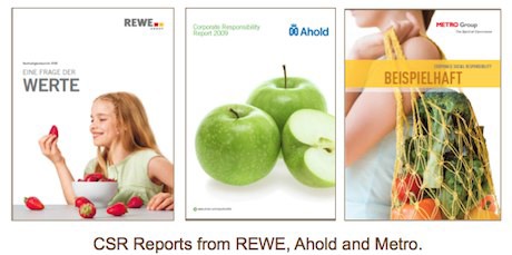 Infine, frutta e verdura sono percepiti come prodotti sostenibili: non è un caso se molte catene di supermercati utilizzano immagini di frutta e verdura per veicolare al pubblico il proprio messaggio di responsabilità sociale d'impresa (nella foto sotto, alcuni esempi di utilizzo di immagini ortofrutticole da parte delle catene Rewe, Ahold e Metro).