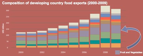 Se si guarda al commercio globale di frutta e verdura, si nota come esso sia in crescita costante, grazie al miglioramento della tecnologia di trasporto merci e a una maggiore domanda. Se però si analizzano in dettaglio quali paesi stiano trainando questa crescita, si nota che sono quelli in via di sviluppo, nei quali, tanto sul fronte delle importazioni, quanto su quello delle esportazioni, è proprio la componente ortofrutticola ad aver messo le "ali ai piedi" agli scambi commerciali.