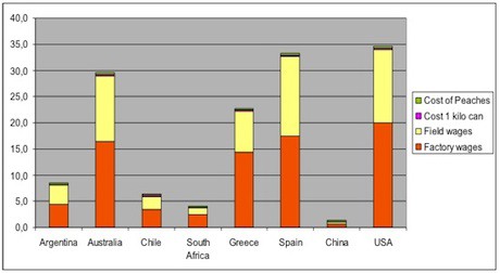 Costi di produzione delle pesche sciroppate nei principali paesi produttori: in verde il costo delle pesche, in fucsia il costo di un kg in scatola, in giallo e in arancione rispettivamente i salari in campagna e nell'industria. Sono questi ultimi due che incidono maggiormente. (Fonte Profel, 2009).