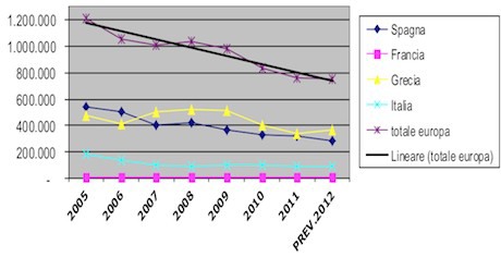 Italia e Francia: meno 5-10% rispetto al 2011.