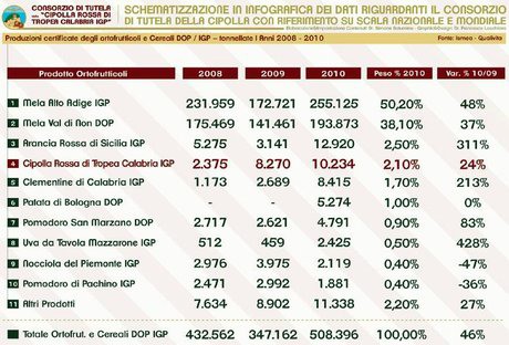A livello di peso produttivo, infatti, la produzione certificata dal Consorzio ha visto una crescita esponenziale in termini di volume, passando dalle 2,3 tonnellate del 2008, alle 8,2 del 2009, per arrivare a 10.234 ton nel 2010 (+24% rispetto al 2009). Grazie a questa evoluzione, oggi la Cipolla Rossa di Tropea rappresenta la quarta produzione certificata di maggior rilievo nel nostro Paese, preceduta solo dalla Mela Alto Adige IGP (primo posto), la Mela Val di Non DOP (secondo posto) e l'Arancia Rossa di Sicilia IGP (vedi tabella qui sotto).