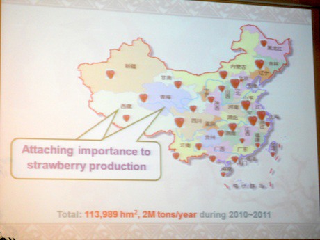 Yuntao Zang, della Beijing Academy of agriculture and forestry sciences, ha confermato come la Cina – con una superficie nel 2010 di 113.989 ettari e 2 milioni di ton di produzione (vedi foto sotto) - stia affermandosi come primo paese produttore ed esportatore di fragole nel mondo. Tra le cultivar più diffuse ‘Toyonoka’, ‘Sweet Charlie’, ‘Camarosa’.