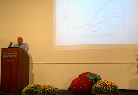 Ha aperto i lavori della seduta mattutina il prof. Carlos H. Crisosto (nella foto sotto), dell’università di Davis, California, che ha esposto sugli aspetti generali di tecnologie ed esperienze post raccolta. Tra le diverse “raccomandazioni”, Crisosto ha insistito in particolare sull’importanza di una buona ventilazione per ottenere risultati efficienti (e cioè raffreddare in fretta e in modo uniforme i frutti) nella conservazione delle fragole.