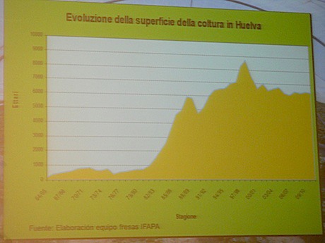 Con i risultati produttivi della campagna 2011/12, ha annunciato Juan Jesus Medina Minguez dell’IFAPA di Moguer (Huelva), la Spagna si conferma terzo paese produttore mondiale di fragola dopo Stati Uniti e Cina. La concentrazione della superficie e produzione destinata a questa coltura nella costa di Huelva continua ad crescere, rappresentando più del 90% del totale nazionale (6.400 ha). Il 26% della superficie è stato destinato a ‘Sabrosa’ (Candonga®), il 22% a ‘Splendor’, quindi ‘Camarosa’ (16%), ‘Florida Fortuna’ (13%), ‘Sabrina’ (7%). Durante le ultime tre stagioni, la produzione è oscillata tra le 225.800 e le 302.600 ton. La produzione 2011/2012 è stata destinata per il 75% al consumo fresco e per il 25% alla trasformazione. L'export in Europa ha rappresentato l’80-85% delle vendite, principalmente verso Francia, Germania, Inghilterra e Italia, con un fatturato di 404,10 milioni di euro (+18%).