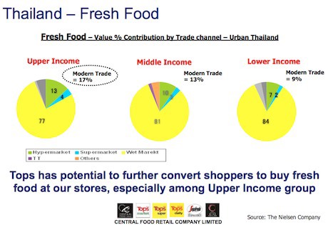Valore percentuale degli alimenti freschi in Thailandia per canale commerciale. Da sinistra a destra, le torte rappresentano i consumatori ad alto, medio e basso reddito. In giallo i mercati tradizionali, in verde gli ipermercati, in azzurro i supermercati. Il marchio Tops ha il potenziale per convincere i clienti ad acquistare cibo fresco nei negozi Central Food Retail, soprattutto nella fascia di reddito superiore.