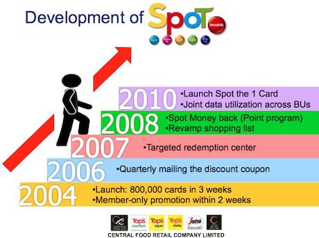 Ideato nel 2004, Spot è il primo programma di fidelizzazione realizzato da un retailer in Thailandia: oggi conta una platea di oltre 5,8 milioni di aderenti. Ogni volta che si effettuano acquisti, infatti, il programma Spot permette di guadagnare punti, di risparmiare e di ottenere speciali ricompense. L'acquisto combinato su tutti i magazzini Central Food Hall e Tops permette inoltre di acquisire privilegi extra.