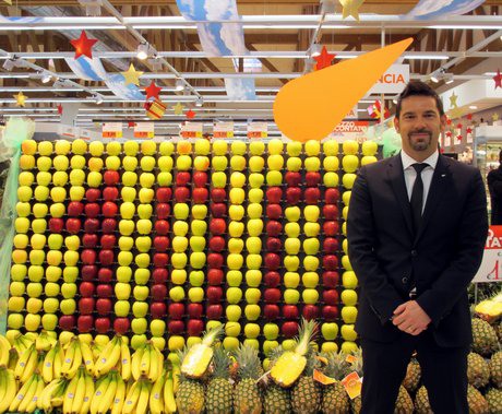 Giuliano Canella posa accanto ad un display di frutta che celebra l'apertura del centesimo punto vendita della catena.