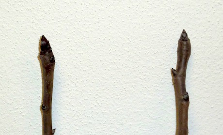A sinistra, un brindillo: ramo di un anno con gemma terminale mista che tende a differenziare nel secondo anno le gemme miste dalla base al 50% della sua lunghezza. A destra, un ramo vegetativo: ramo di un anno con gemma terminale vegetativa che tende a differenziare nel secondo anno le gemme miste dal 50% della sua lunghezza fino all'apice. "Quando si pota - dice Fabio Galli - si tende a rispettare maggiormente il brindillo per mantenere la differenziazione a fiore il più vicino possibile all'ossatura della pianta".
