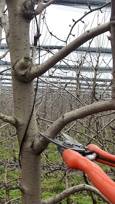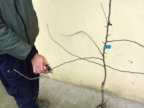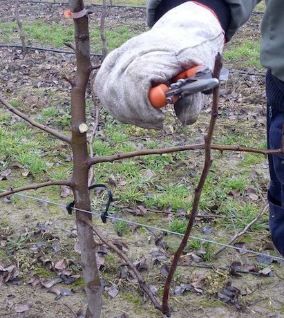 Si effettuano operazioni come quella del raccorciamento della cima (nella foto sopra) per eliminare la dominanza apicale e favorire la schiusura delle gemme sottostanti determinando così quella che sarà l'altezza della pianta. Questa operazione è comune per tutte le varietà di pero.