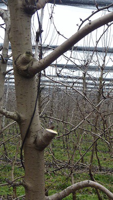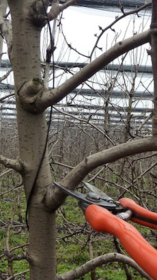 Si effettuano operazioni come quella del raccorciamento della cima (nella foto sopra) per eliminare la dominanza apicale e favorire la schiusura delle gemme sottostanti determinando così quella che sarà l'altezza della pianta. Questa operazione è comune per tutte le varietà di pero.
