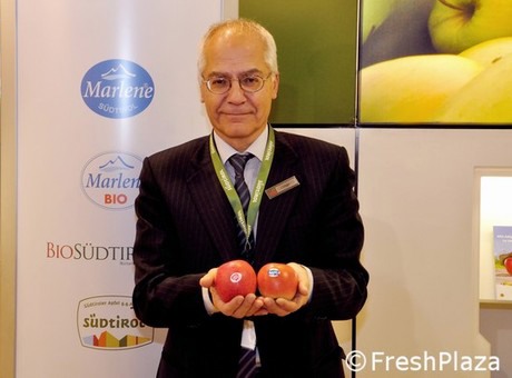 Gerhard Dichgans, direttore del Consorzio VOG, mostra due "cavalli di battaglia" nell'assortimento commerciale: le mele Pink Lady® e Kanzi®.