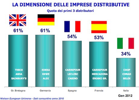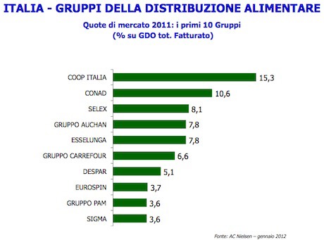 Per rendere l'idea, nel 2012 il fatturato di Coop Italia è stato pari a 13,2 miliardi di euro, quello Conad a 10,9 miliardi, mentre Esselunga ha raggiunto i 6,8 miliardi. Nello stesso anno, fermandosi in Europa, la francese Carrefour fatturava oltre 88,4 miliardi di euro, l'inglese Tesco 79,3, la tedesca Metro Group 72,5 miliardi.