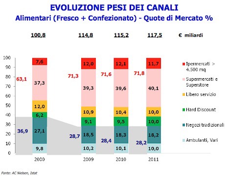 Nel 2011, le quote di mercato di Supermercati e Superstore (in colore rosa nel grafico) corrispondevano al 40,1% (Dati AC Nielsen per Federdistribuzione).