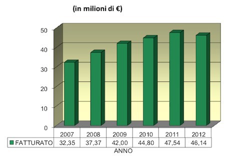 Dopo aver rimarcato la situazione di stabilità degli ultimi tre anni, il presidente Renzo Piraccini è passato alla lettura dei dati salienti del bilancio 2012. La Cooperativa - che riunisce 1.023 aziende della filiera ortofrutticola - ha realizzato un fatturato di 46,14 milioni di euro, in linea con il 2011 (vedi grafico sottostante).