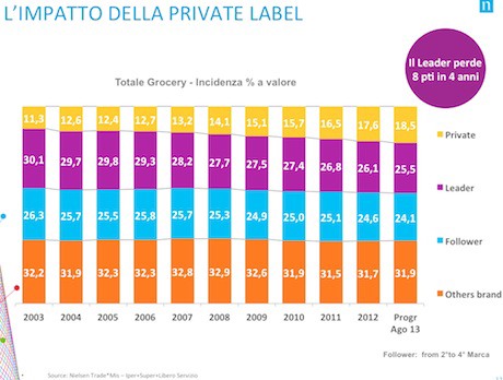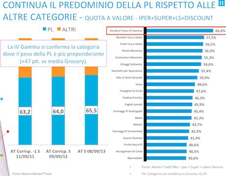 Cresce progressivamente l'incidenza della "Private Label" (cioè della marca commerciale del distributore), con una progressione che oggi conferma la IV gamma come la categoria dove il peso della Private Label è più preponderante rispetto alle altre categorie.