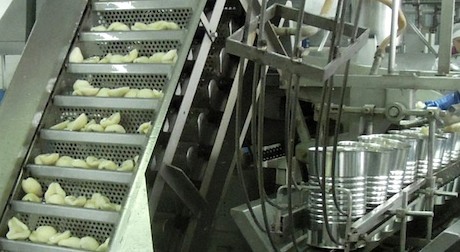 Ori Frigo dispone anche di una linea di produzione di pere allo sciroppo (nelle foto sotto alcuni momenti del processo): trasforma annualmente circa 1.500 ton di pere Williams, di cui il 50% proveniente dai frutteti di proprietà del gruppo. Il prodotto, destinato alla pasticceria professionale o industriale e al catering, è apprezzato soprattutto in Francia, mercato che rappresenta circa il 70% del fatturato aziendale; il restante 30% è determinato dalle vendite in Austria, Germania, Gran Bretagna e Italia.