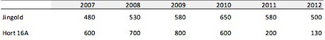 I dati elaborati dal Cso-Centro servizi ortofrutticoli di Ferrara, riportati nella tabella sottostante, evidenziano come nelle principali regioni produttrici (Veneto, Emilia-Romagna, Piemonte e Lazio), in particolare nel triennio 2010-2012, le principali varietà abbiano registrato un vero crollo degli investimenti. La Jingold è passata da 650 a 500 ettari e la Hort 16A addirittura da 600 a 130 ettari.