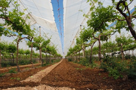 - Protezione con reti antigrandine: la conduzione non induce variazioni del periodo di maturazione delle varietà coltivate. Foto sotto: tendone con sola rete antigrandine.