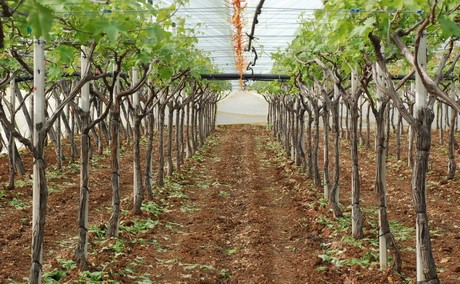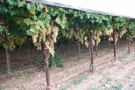 - Protezione con reti antigrandine e copertura con teli in plastica per l'anticipo di maturazione: Questo tipo di conduzione, che viene adottato per anticipare l'epoca di maturazione delle varietà precoci, prevede l'epoca di copertura degli impianti nel mese di dicembre. Foto sotto: uva Vittoria coperta per anticipo maturazione.