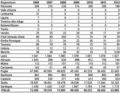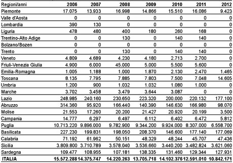 Dettaglio regionale - Evoluzione anni 2006-2012 (Elaborazione CRA-UTV su dati ISMEA) - Clicca qui per ingrandire la tabella.