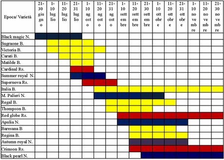 Periodo di raccolta delle principali varietà di uva da tavola prodotte in Italia (la commercializzazione può iniziare con anticipo di circa due decadi in Sicilia per uve di serra e può proseguire fino a gennaio con uva frigoconservata) - Clicca qui per ingrandire la tabella.
