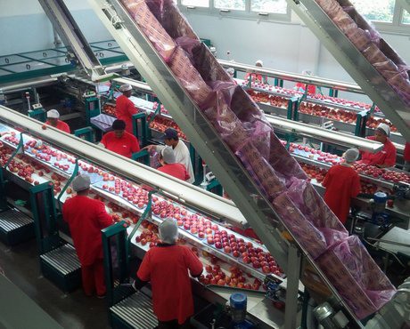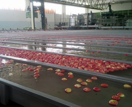 Le mele raccolte vengono stoccate in celle ad atmosfera dinamica e preservate mediante l'inibitore di etilene 1-MCP (Smartfresh). Successivamente, vengono calibrate (sopra) e confezionate (sotto).