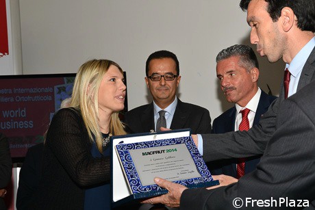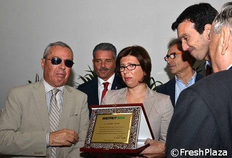 Serena Pittella riceve la targa in memoria di Gennaro Galdiero: carisma unico e abile nell'equilibrio dei rapporti umani, tra fermezza e comprensione, innovatore e stimolatore del proprio e altrui lavoro, ha contribuito al successo della filiera ortofrutticola italiana.