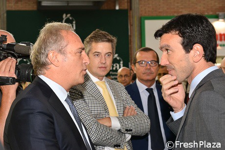 In visita tra gli stand, Martina ascolta il presidente di Fruitimprese, Marco Salvi che ha spiegato a FreshPlaza: "Non abbiamo sfruttato i primi aiuti UE a favore dei prodotti soggetti all'embargo russo anche perché i Paesi che scelgono di non raccogliere sono avvantaggiati rispetto a quelli che, optando per la beneficenza, sono costretti a tempistiche differenti. Nella distribuzione delle risorse, poi, non va dimenticato il peso che ogni Stato membro ha in termini produttivi".