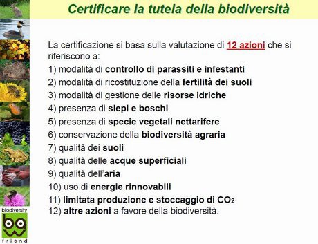 Come si legge nell'elenco riportato qui sopra, sono state specificate, nel disciplinare relativo all'ottenimento della certificazione "Biodiversity Friend", le 12 azioni (ciascuna con uno specifico punteggio di merito) che le aziende agricole devono adottare per accrescere quantità di forme di vita e qualità degli ambienti naturali nei quali si realizzano le coltivazioni. Un punteggio minimo di 60/100 consente di accedere alla certificazione, ma l'obiettivo finale è quello di avvicinarsi quanto più possibile ad un punteggio pieno di 100/100.