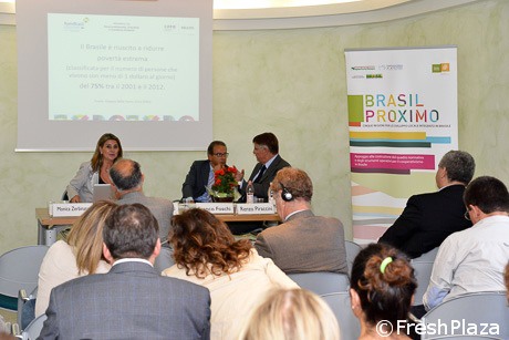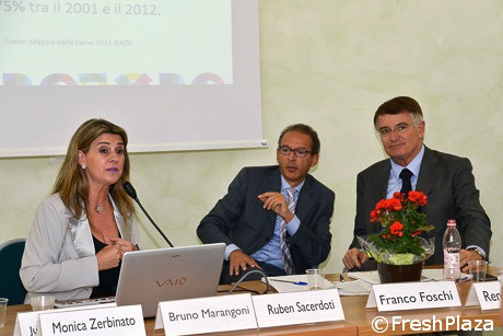 Monica Zerbinato, vicepresidente della Commissione interministeriale brasiliana per Expo 2015, Ruben Sacerdoti, responsabile servizio Sportello regionale per l'internazionalizzazione e Renzo Piraccini, vicepresidente Macfrut che ha moderato l'incontro.