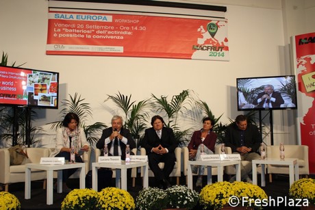 Il secondo convegno dedicato alla batteriosi durante il Macfrut. Da sinistra a destra: la moderatrice dell'incontro, Elisa Lupotto (CRA), Luciano Trentini (CSO), Marco Mingozzi (Officine Mingozzi), Loredana Antoniacci (Servizio Fitosanitario dell'Emilia-Romagna) e Marco Scortichini (CRA).