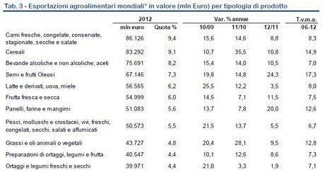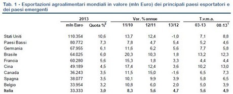 Nel 2013 l'Italia ha esportato prodotti agroalimentari (una categoria che oltre a frutta e ortaggi comprende molte altre categorie come carni, latticini, commodities e molto altro) per 33,333 miliardi di euro, coprendo il 3% della quota mondiale e attestandosi al 10 posto nel ranking mondiale. Rispetto all'anno precedente le esportazioni sono cresciute del 4,7% registrando così un rallentamento del tasso di crescita: rispetto all'anno precedente il tasso di crescita delle esportazioni era stato di un +5,6% nel 2012 e di un +8,3% nel 2011.