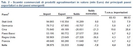 Sempre nel 2013 l'Italia ha importato prodotti agroalimentari per 38,975 miliardi di euro, attestandosi così come il settimo maggiore importatore mondiale.