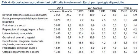 Rappresentano il nono prodotto agroalimentare italiano maggiormente esportato, per un valore di 1,348 miliardi di euro, il 4% del totale. Rispetto al 2012 si è vista una crescita del 4,9%.