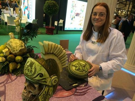 Menzione speciale per l'artista allo stand della Procomel, impegnata da due giorni nella complicata arte dell'intaglio della frutta. Sotto lo sguardo di tanti e incuriositi visitatori crea splendide sculture a partire da un melone.