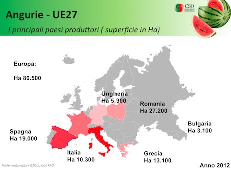 Le importazioni costituiscono poco meno del 10% della produzione nazionale che, dal canto suo, alimenta una interessante esportazione; sono infatti circa 150.000 le tonnellate di angurie e mini angurie inviate prevalentemente nei paesi europei, e in particolare in Germania, Polonia, Francia, Repubblica Ceca, Austria e Svizzera.