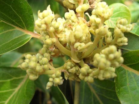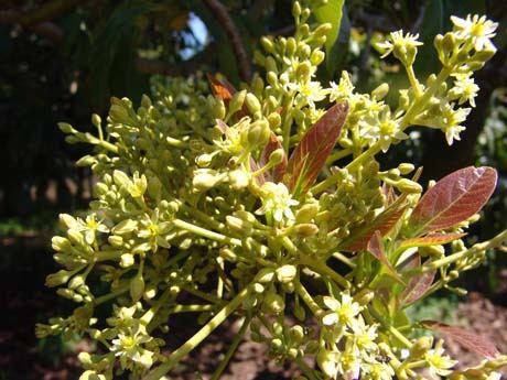 La fase fenologica della fioritura dell'avocado. I fiori sono ermafroditi e sono caratterizzati dal fenomeno della dicogamia, cioè quando è attivo l'organo femminile, il gineceo, non è attivo l'organo maschile, l'androceo. In natura ci sono varietà di avocado che appartengono al gruppo A e altre che appartengono al gruppo B. In un frutteto occorre coltivare piante dei due gruppi per avere un'ottima impollinazione incrociata. (Foto: Ottavio Cacioppo)