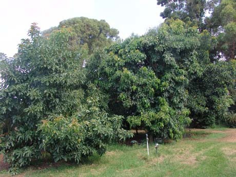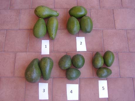 Le varietà di avocado coltivate nella piantagione sperimentale di Latina. Numero 1= Zutano, numero 2=Bacon, numeri 3-4-5= varietà ottenute nell'azienda di Latina da piantine da seme, denominate rispettivamente Sabaudia uno, Sabaudia due e Sabaudia 3. (foto: Ottavio Cacioppo)