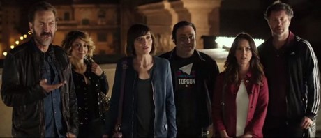 Sulle prime, Marcello (Claudio Bisio, a destra) è poco convinto dei suoi nuovi compagni di viaggio. Screenshot dal film (fonte youtube).