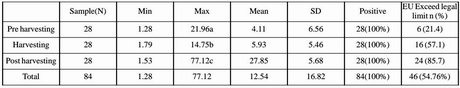 Dalle analisi è emerso che il 100% dei pistacchi conteneva aflatossina B1 prima della raccolta, alla raccolta e durante la conservazione. Il valore più alto rilevato è stato di 27,58 µg/kg su campioni dopo la raccolta. In tutte le fasi considerate, quasi il 55% dei campioni superava il limite massimo di 2 µg/kg stabilito dal regolamento UE. Inoltre i valori di aflatossina sono aumentati significativamente durante la conservazione.