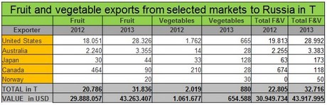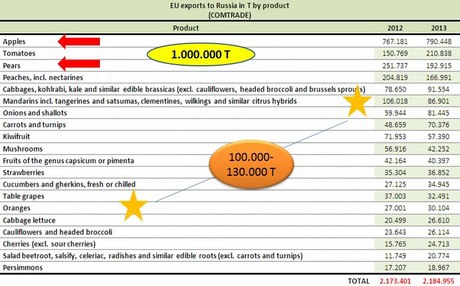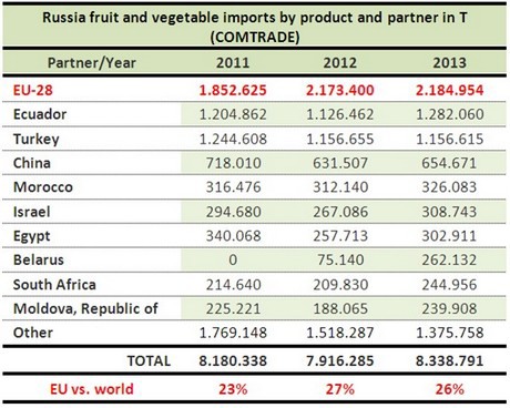 Interessante il confronto tra quanto la Russia importava dall'Europa e quanto importato invece dal resto del mondo. Nel 2011, i prodotti europei coprivano il 23% delle importazioni complessive in Russia e l'anno dopo si era saliti di ben 4 punti percentuali, arrivando al 27%. Nel 2013, i prodotti europei coprivano il 26% dell'import russo; insomma, fino all'anno scorso, prima dell'embargo, un ortofrutticolo su quattro che giungeva in Russia era di origine europea.