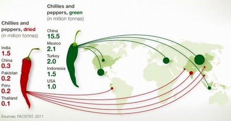 Per quanto riguarda il peperoncino piccante essiccato, l'India risulta di gran lunga il primo paese produttore, con 1,5 milioni di tonnellate, seguito da Cina (0,3 mln ton), Pakistan (0,2 mln ton), Perù (0,2 mln ton) e Thailandia (0,1 mln ton). Passando invece ai peperoncini verdi, la Cina balza in testa alla classifica con ben 15,5 milioni di tonnellate, seguita da Messico (2,1 mln ton), Turchia (2 mln ton), Indonesia (1,5 mln ton) e USA (1 mln ton).