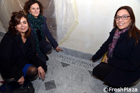 Qui sopra: Connie Maggio, Sara Giuseppini e Alessandra Pinarelli in rappresentanza della International Italmarmi. Sotto: i presenti alla conferenza stampa.