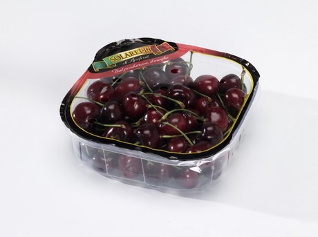 Il vassoio termosaldato da 500 gr, uno dei formati delle ciliegie Solarelli, marchio Apofruit.