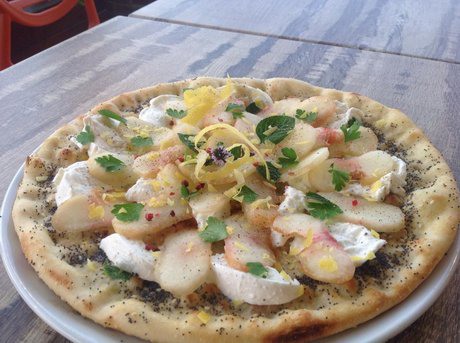 Pizza Masako, ingredienti: pesca Saturnia, mozzarella di bufala, semi di sesamo e papavero, menta, prezzemolo, bucce di limone tagliate sottili, pepe, aceto bianco, succo di limone, evo, sale marino