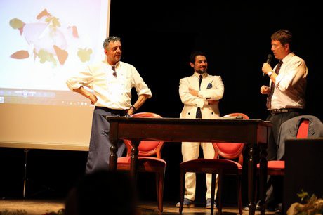 Lo Chef Mauro Uliassi, Marco Eleuteri e il critico enogastronomico Francesco Annibali, presso il Teatro delle Logge a Montecosaro per l'evento "Uliassi on the Peach"
